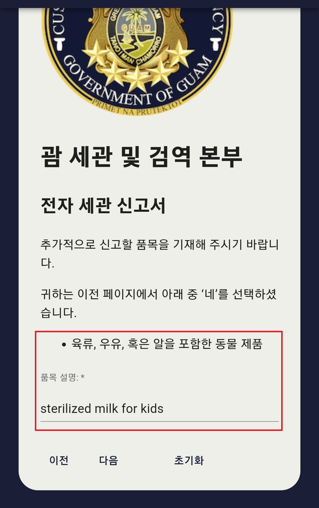 - 5단계 : 물품 신고 (고기, 우유, 알 등)