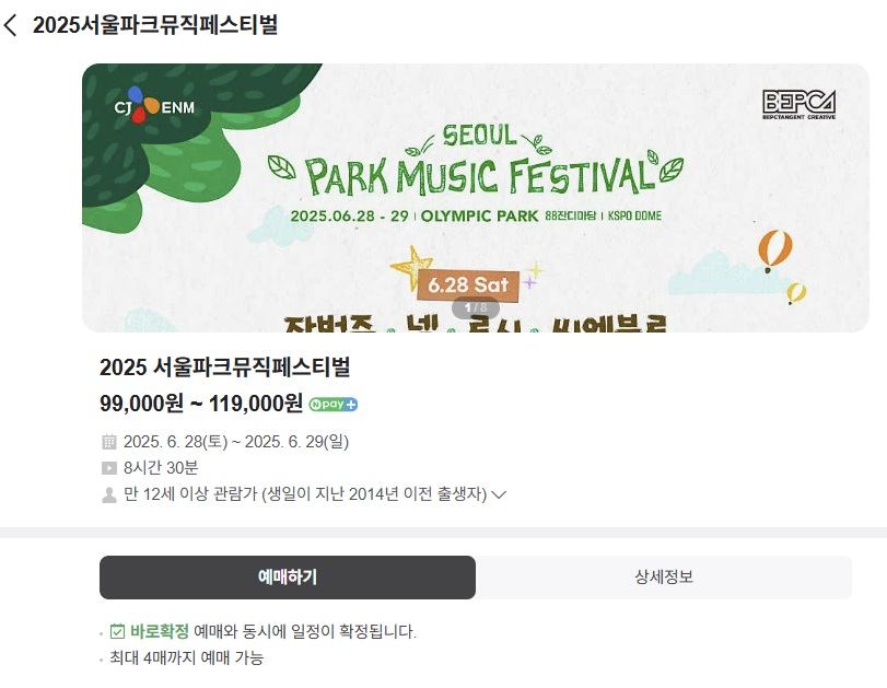 서울파크뮤직페스티벌 예매는 인터파크 또는 네이버 예약을 통해 가능합니다.